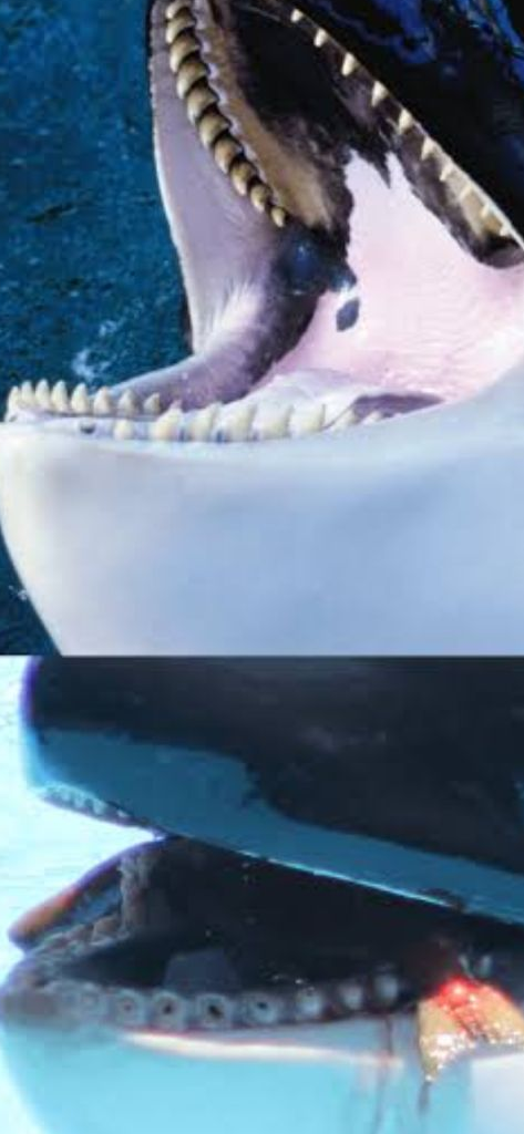 The image you see on the side shows an orca (killer whale!) that has filed down its teeth due to stress from being kept in a confined space.