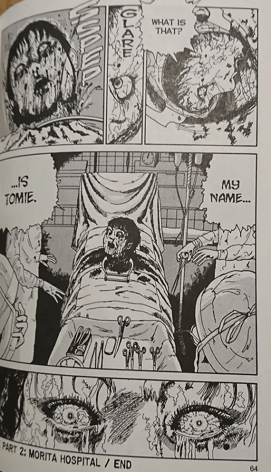 This chapter is disturbing because the enforcer of the violence is not a man, but a woman. Tomie is not outside the patriarchal system; she has gained power from within it and uses that power against other women. As the girl in the hospital recovers, she loses her face, her body, her identity. But the metaphor of “recovery” also ensures the patient’s survival. This transformation symbolizes how society’s “ideal woman” model operates by destroying individuality. Tomie’s healing of the girl in the hospital ward by transforming her into herself symbolizes how a woman’s body is considered “sick” unless it conforms to patriarchal norms, and how she is forced to relinquish her individuality to gain acceptance.